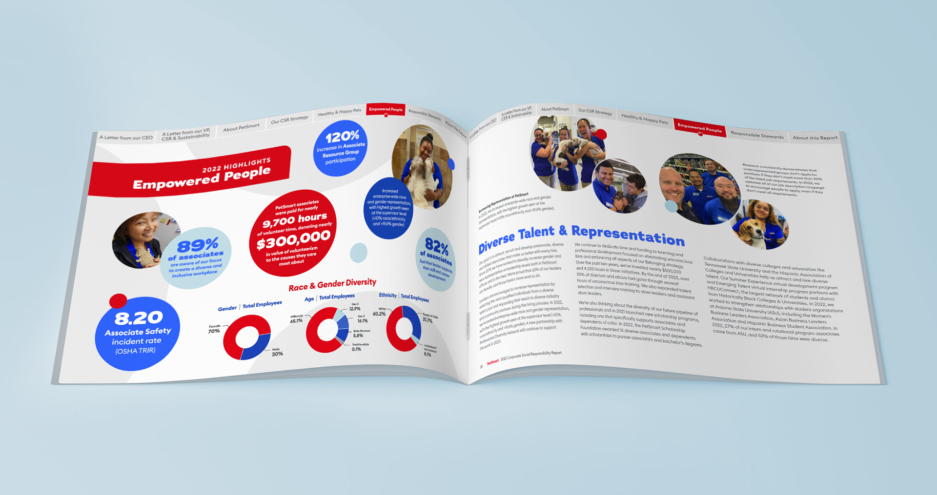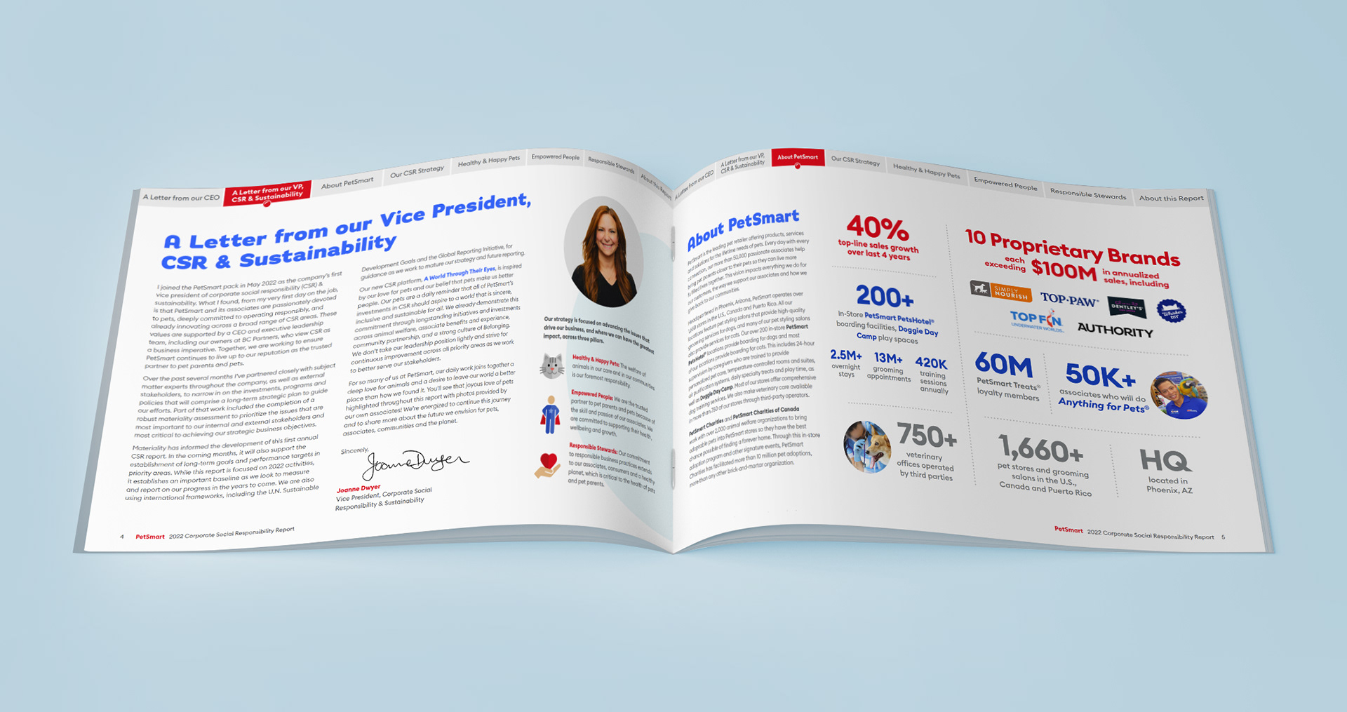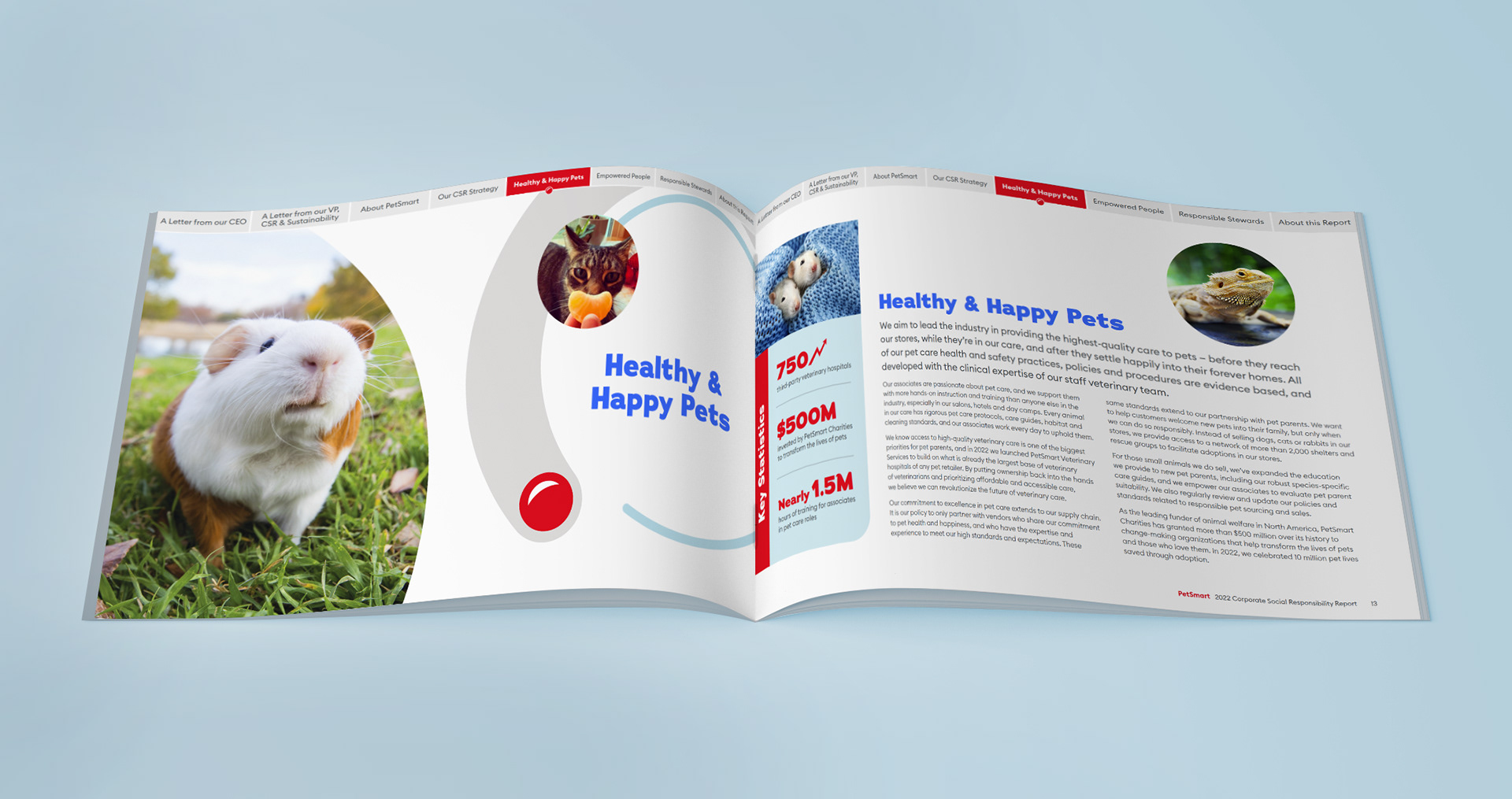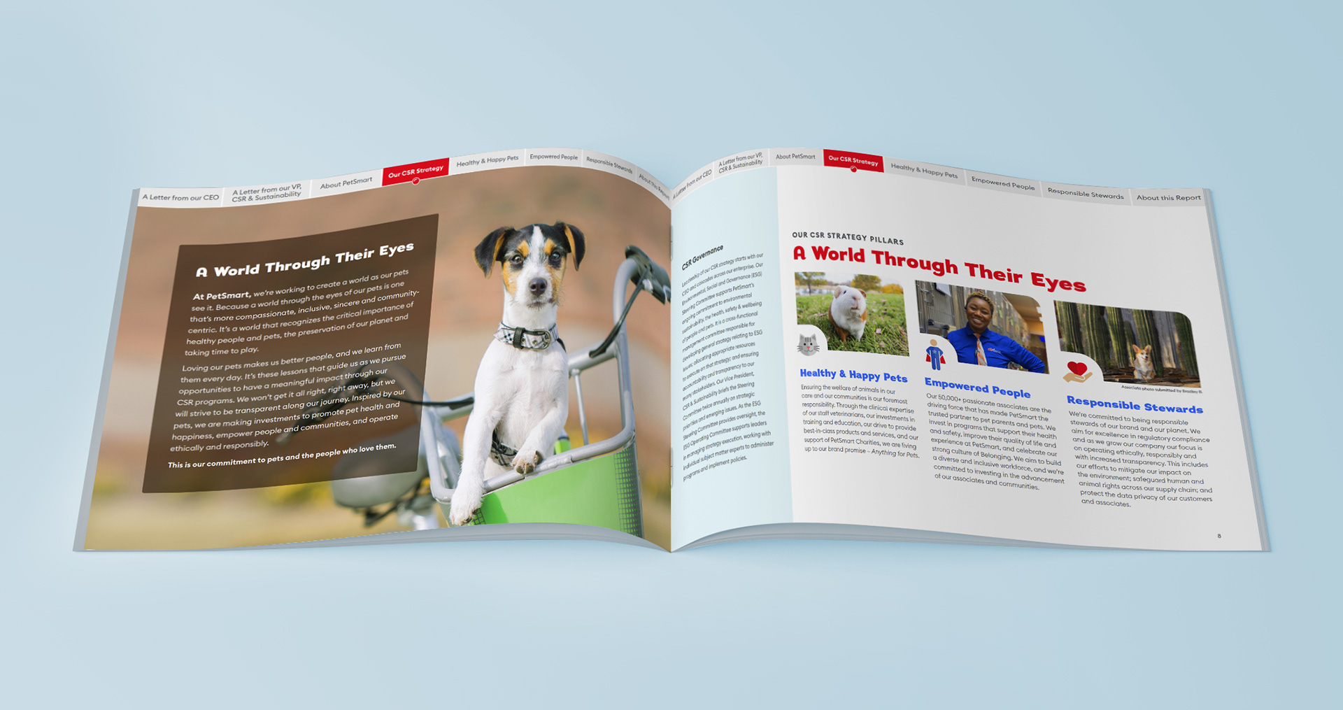 While working at "(add)ventures" I was entrusted with leading the art direction, design and layout for PetSmart's very first Corporate Social Responsibility report. Being the first of its kind, it was important the piece envelop the jovial spirit of the brand with a touch of seriousness to support the overall impact of the objective – understanding PetSmart's investment in their ethical , environmental, philanthropic and economic impact.